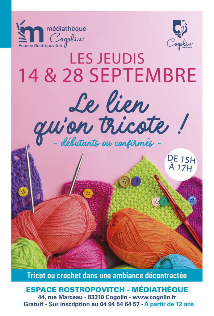 Rejoignez-nous à la médiathèque pour l’atelier « Le lien qu’on tricote » ! Que vous soyez débutant ou confirmé, venez partager un moment de détente autour du fil et des aiguilles.