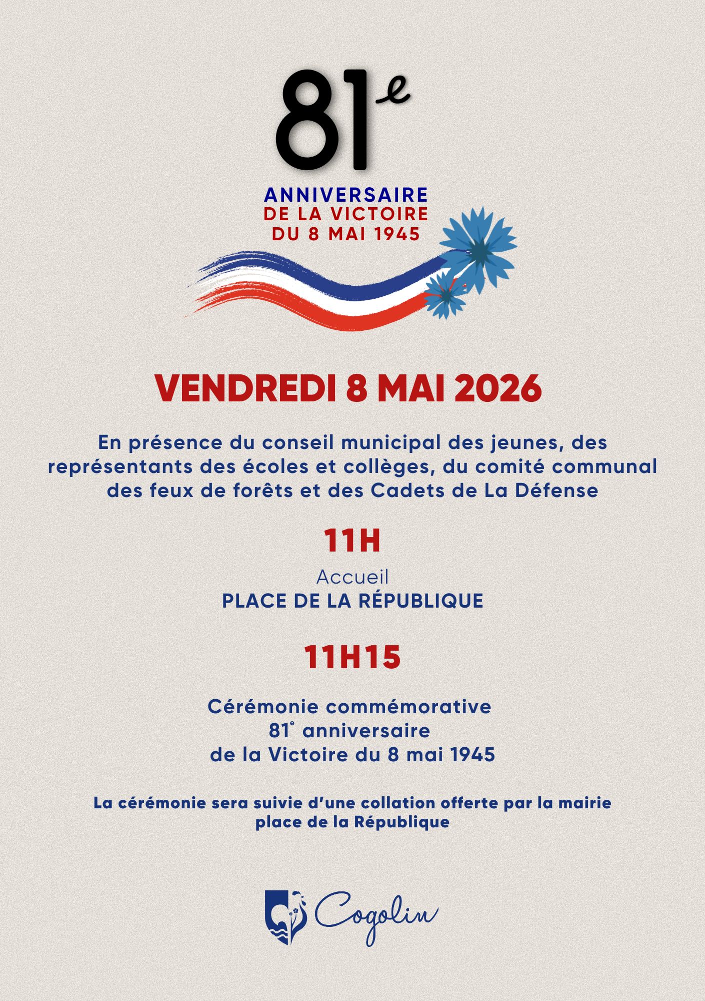 La Ville de Cogolin vous invite à participer à la cérémonie commémorative du 81e anniversaire de la Victoire du 8 mai 1945.