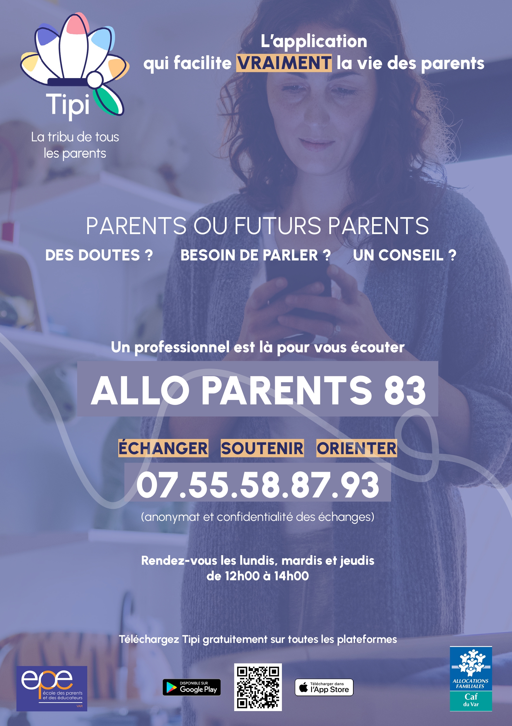 Allô Parents 83 est un dispositif gratuit, anonyme et confidentiel, proposé par l’École des Parents et des Éducateurs du Var avec le soutien de la CAF du Var. Il s’adresse à tous les parents et futurs parents qui rencontrent des interrogations ou des difficultés dans leur rôle éducatif.