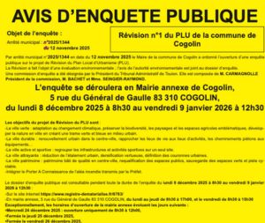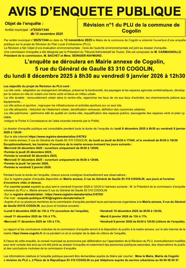 - Par courrier, expédié au plus tard le vendredi 9 janvier 2026 à 12 h 30, à l’adresse suivante : M. le Président de la commission d’enquête « révision du PLU », Mairie annexe 5 Rue du Général de Gaulle 83 310 COGOLIN