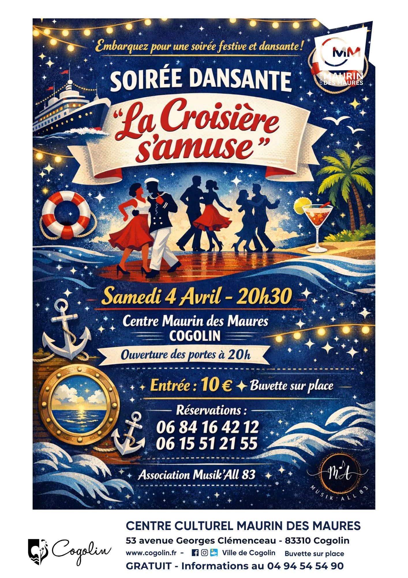 La troupe MUSIK’ALL 83 vous propose une soirée dansante autour de son nouveau spectacle « La Croisière s’amuse ». Cette représentation musicale propose un itinéraire varié en chansons, invitant le public à profiter de la piste de danse au fil des différentes escales.